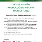 1Jornada: Collita de raïm producció de vi i cava Firagost'23Jornada: Collita de raïm producció de vi i cava Firagost'23Time: 9:30 - 12:00 Jornada: reptes i futur de la DO Cava, a càrrec de Alexadre Comellas, secretari del Consell Regulador de la DO Cava; visió estratègiva de les cooperatives, de la mà de Joan Josep Raventós, responsable sectorial de la vinya i del vi de la FCAC; Situació de la pagesia, a càrrec de Josep Marrugat, responsable nacional del sector de la vinya i el vi de la Unió de Pagesos de Catalunya./// Dia: Dimarts 1 d'agost de 2023/// Hora: 9:30 hores./// Lloc: espai Kursaal de Valls./// Inscripcions: comunicacio@cambravalls.com/// Programa: https://cambravalls.com/wp-content/uploads/2021/04/jornada-unio-pagesos-collita-de-raim_page-0001.jpg///