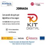 Com accedir als ajuts per digitalitzar el teu negociCom accedir als ajuts per digitalitzar el teu negociTime: 16:00 - 17:00 Continguts: Vine a la propera jornada organitzada per la Cambra de Comerç de Valls i esbrina què és el Kit Digital i com el vostre negoci pot beneficiar-se dels ajuts per a la digitalització. També us donarem a conèixer nous ajuts i subvencions entorn la Indústria 4.0 que s’obriran en breu. Una jornada que compta amb el suport de red.es, la Cámara de Comercio de España i la Unió Europea./// Dia: Dimecres 14 de desembre del 2022/// Hora: 16:00 hores/// Presencial: Cambra Comerç de Valls/// Sessió: gratuita/// Inscripcions: https://forms.gle/Px8WziEMaMwMYKR86///