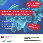 11Curs: Certificat oficial de legionel·la i renovacióCurs: Certificat oficial de legionel·la i renovació Continguts: Importància sanitària de la legionel·losi, àmbit legislatiu, salut pública i salut laboral, identificació de punts crítics, pràctiques i avaluació. Dirigit a professionals i empreses dedicades al manteniment, tractament i desinfecció d'instal·lacions de risc./// Calendari del curs: dies 11, 12, 14,19 i 21 de desembre./// Durada: 25 hores/// Horari: de 15 a 20h/// Lloc impartició: Cambra Comerç Valls/// Programa: https://cambravalls.com/wp-content/uploads/2023/10/Legionella-Certif.-Oficial-desembre-2023.pdf///