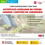 23FOAP: activitats auxiliars en vivers i centres de jardineriaFOAP: activitats auxiliars en vivers i centres de jardineria Objectiu del curs: Executar operacions auxiliars per a la implantació i manteniment de jardins, parcs i zones verdes, així com per a la producció i manteniment de plantes en vivers i centres de jardineria/// Lloc: Sala d'Actes Cambra Comerç de Valls/// Inici del curs: JUNY 2025/// Hores: 350h./// Modalitat: Presencial./// Inscripcions: formacio@cambravalls.com///Aquesta actuació està impulsada i subvencionada pel Servei Públic d’Ocupació de Catalunya (SOC) amb fons rebuts del Ministeri d’Educació, Formació Professional i Esports i del Servei Públic d’Ocupació Estatal (SEPE)///