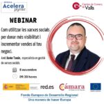 | 8Xarxes Socials per ser més visibles i vendre mésXarxes Socials per ser més visibles i vendre mésTime: 9:30 - 11:00 WEBINAR: Com utilitzar les xarxes socials per donar més visibilitat i incrementar vendes al teu negoci, amb Xavier Tomàs, especialista en gestió de xarxes socials. Un webinar on descobrirem com arribar al públic objectiu, l'ús d'eines per maximitzar els resultats de la teva empresa, com incrementar les vendes i la fidelització dels clients, o com ampliar la base de dades, entre d'altres. Una iniciativa impulsada per red.es, la Cambra d'Espanya i la Unió Europea./// Dia: Dimarts 8 de novembre del 2022/// Hora: 09:30 hores/// Virtual: plataforma zoom/// Sessió: gratuita/// Inscripcions: https://forms.gle/ZCME38pwTJtSVziD7///