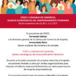 | 28Jornada: CESCE i Cambres de ComerçJornada: CESCE i Cambres de Comerç Continguts: El proper 28 de novembre a les 10:30h tindrà lloc la jornada "Cesce i Cambres de Comerç, aliats estratègics de l'emprenedoria femenina" a la seu de la Cambra de Comerç d'Espanya. Durant la jornada coneixeràs de primera mà les principals actuacions dutes a terme per ambdues organitzacions per impulsar el talent empresarial femení així com experiències de dones emprenedores./// Dia: Dimarts 28 de novembre del 2023./// Hora: 10:30h/// Format: Virtual./// Informació i inscripcions: https://www.camara.es/streaming-cesce-y-camaras-de-comercio-aliados-estrategicos-del-emprendimiento-femenino///