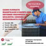 13Curs: Gasos fluorats. Programa formatiu 1Curs: Gasos fluorats. Programa formatiu 1 Continguts: Manipulació d'equips amb sistemes frigorífics de qualsevol càrrega de refrigerants florats. Un curs homologat pel Departament d’Indústria de la Generalitat de Catalunya. L’objectiu del curs és formar als professionals titulats per obtenir el Certificat acreditatiu de la competència per a la manipulació d’equips amb sistemes frigorífics de qualsevol càrrega de refrigerants fluorats RD 115/2017 Annex II/// Dies: Del 13 al 28 de novembre del 2023./// Durada: 30 hores/// Horari: de 15 a 20h/// Lloc impartició: CET-Reus.///