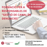27Curs: Gestió de canal de denúnciesCurs: Gestió de canal de denúncies Continguts: el curs servirà per tractar el marc legal, la creació d'una cultura de compliment normatiu, aspectes generals de la Llei 2/2023 de 20 de febrer, confidencialitat i protecció de dades i el règim sancionador, entre d'altres aspectes clau./// Calendari: dies 27 i 29 de novembre 2023 i 4 de desembre del 2023/// Durada: 8 hores///Horari: de 16h a 19:00 h/// Format: virutal/// Inscripcions: https://forms.gle/VywVtFkgDguDzK3Z9/// Continguts del curs: https://cambravalls.com/wp-content/uploads/2023/11/Canal-Denuncies-2023.pdf///