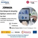 | 14Presentació Oficina Acelera pyme Cambra vallsPresentació Oficina Acelera pyme Cambra vallsTime: 10:00 - 12:00 Titular: Apostem per la digitalització de la teva empresa! En aquesta jornada la directora general de Cámara de Comercio de España, Inmaculada Riera, donarà a conèixer el programa Acelera pyme i les accions de digitalització que s'ofereixen en el marc de les Cambres de Comerç. Es presentaran els serveis de l'Oficina Acelera pyme de la Cambra de Valls perquè les empreses la coneguin i es resoldran dubtes respecte la digitalització i les ajudes del Kit Digital. Una iniciativa impulsada per red.es, la Cambra d'Espanya i la Unió Europea. /// Dia: Divendres 14 d'octubre del 2022/// Hora: 10 hores/// Format: presencial a la Cambra de Comerç de Valls/// Sessió: gratüita/// Inscripcions: https://forms.gle/xHroTA7hwpa26PSTA///