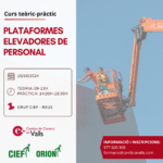 | 10Curs teòric-pràctic: Plataformes elevadores de personalCurs teòric-pràctic: Plataformes elevadores de personal Continguts: Tipologia de plataformes elevadores mòbils de persones, elements de la plataforma elevadora, introducció a la legislació vigent, exercicis pràctics./// Dia: 10 d'octubre de 2024/// Horari: de 9h a 13h i de 14:30h a 18:30h/// Durada: 8 hores/// Lloc: Grup CIEF Reus/// Inscripcions: formacio@cambravalls.com///
