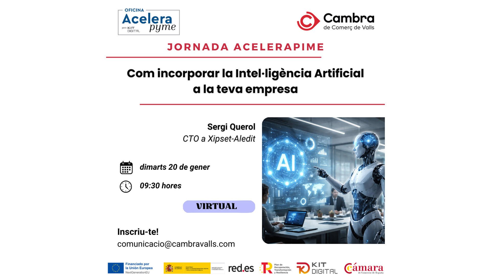 Aquest webinar ha estat el primer del cicle de jornades Accelera Pime 2025 que organitza l’Oficina Accelera Pime de la Cambra de Comerç de Valls per impulsar la digitalització de les empreses, amb la col·laboració del Red.es, Cámara de Comercio de España, Ministerio de Transformación Digital, Plan de Recuperación, Kit Digital i finançat per la Unió Europea.
