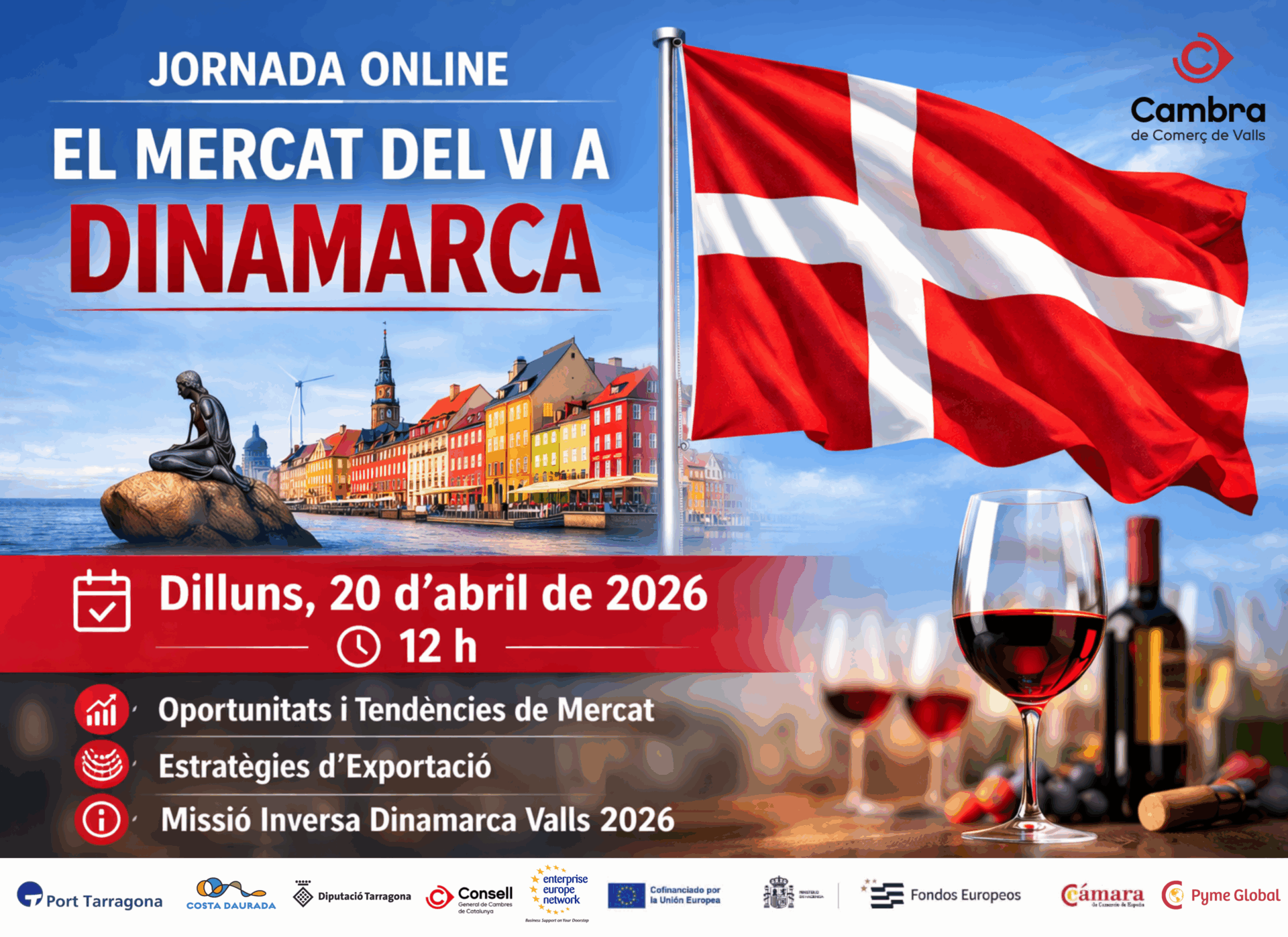 La Cambra de Comerç de Valls organitza una Missió Comercial Inversa amb importadors danesos i holandesos de vi, els dies 5, 6 i 7 de maig, amb l’objectiu de facilitar a les empreses participants l’accés al mercat danès com a prioritat, i a l’holandès com a mercat secundari. Aquesta acció comercial permet a l’empresa poder conèixer importadors sense haver de viatjar a l’estranger i incórrer en despeses de desplaçament.