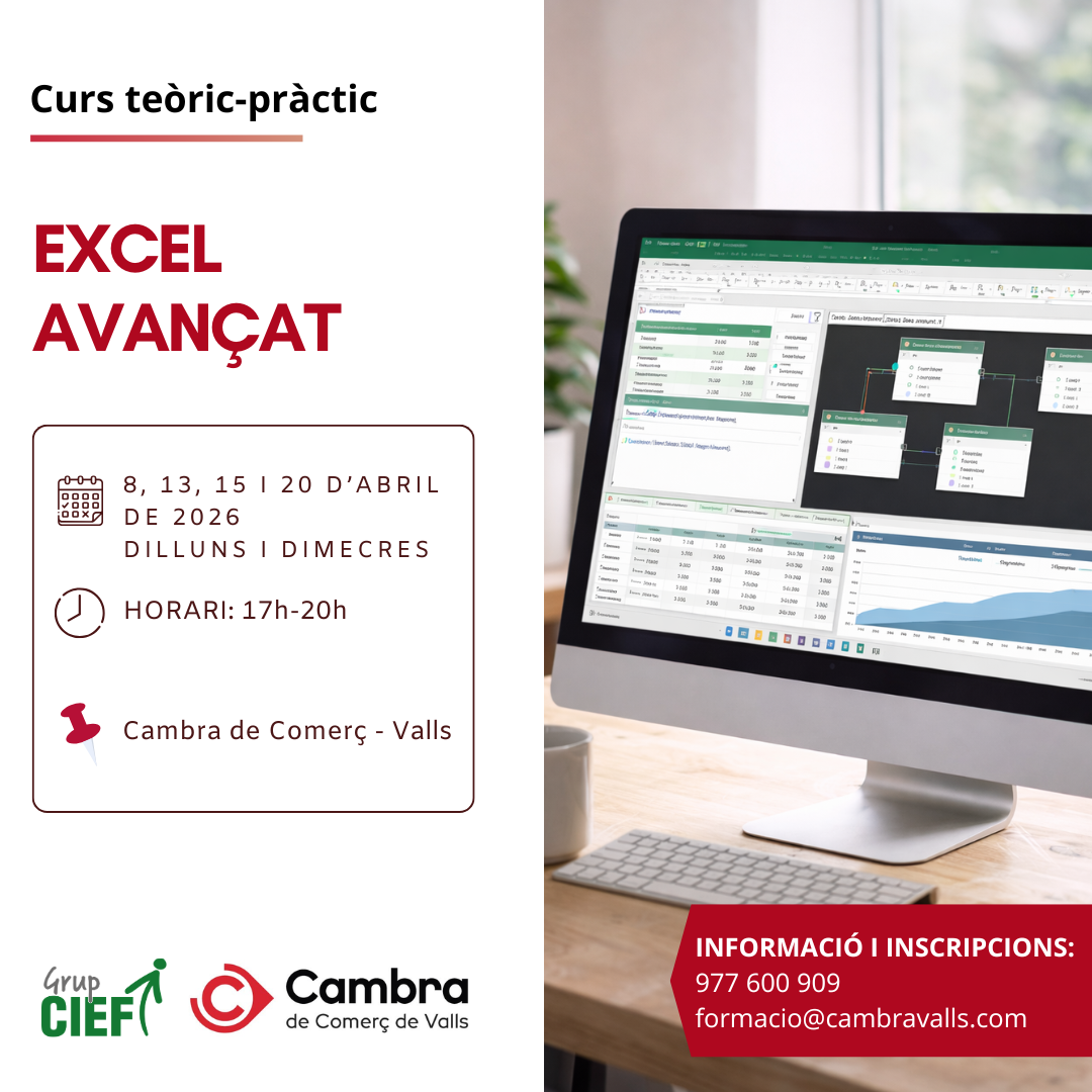 Curs: Excel avançatObjectiu del curs: Aprendràs a dominar funcions avançades d’Excel per analitzar dades i crear informes professionals; utilitzar fórmules com BUSCARV, BUSCARX, SI o SI.CONJUNT; aplicar funcions de data, text i lògica per netejar i transformar dades; crear taules dinàmiques i gràfics avançats per visualitzar informació; i elaborar informes i dashboards per detectar tendències i oportunitats./// Dies: Dillun si dimecres 8, 13, 15 i 20 d'abril de 2026./// Horari: de 17 a 20 hores./// Lloc: Cambra de Comerç de Valls./// Inscripcions: formacio@cambravalls.com ///