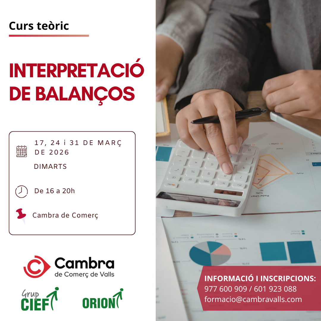 Curs: Interpretació de balançosObjectiu del curs: aprendràs a interpretar correctament el balanç i el compte de resultats, desenvolupar la capacitat d'analitzar la situació econòmica i financera d'una empresa, aplicar tècniques d'analisi financera per avaluar la rendibilitat, la liquiditat i la solvèmncia empresarial, i utilitzar la informació comptable per facilitar la presa de decisions a l'empresa./// Dies: Dimarts 17, 24 i 31 de març de 2026./// Horari: de 16 a 20 hores./// Lloc: Cambra de Comerç de Valls./// Inscripcions: formacio@cambravalls.com ///