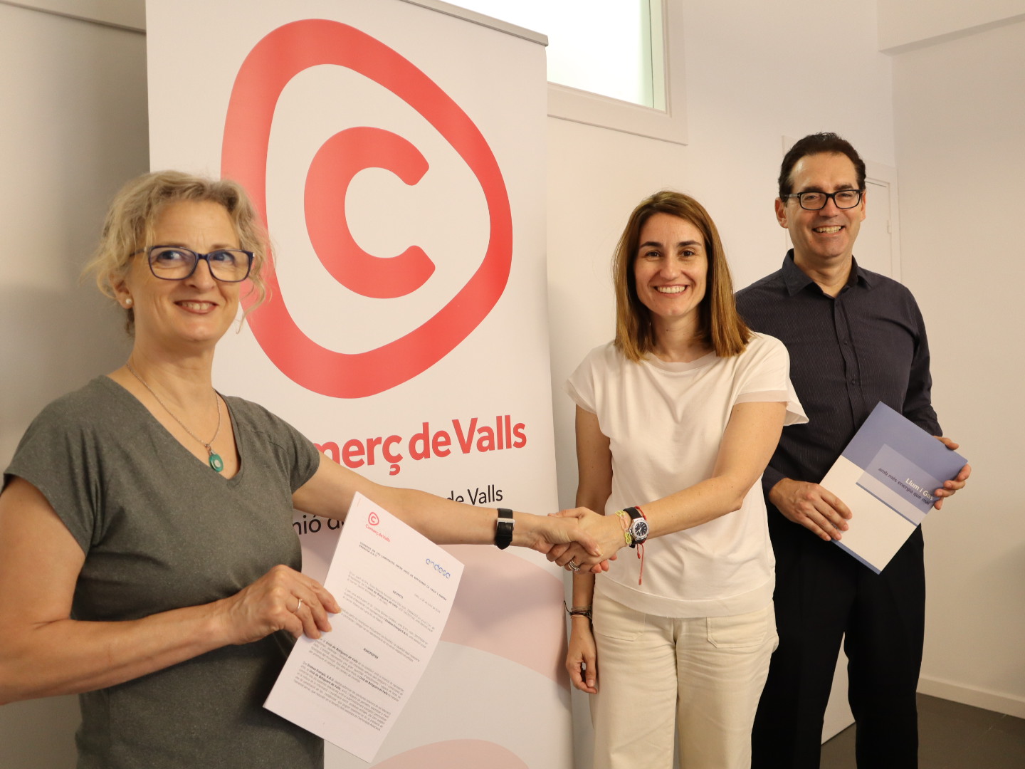 A l’acte de signatura hi han assistit la presidenta de la Unió de Botiguers de Valls, Rosa Baseda, el responsable de Punts de Servei i Oficines Comercials d’Endesa a Catalunya Occidental, Carlos Gómez, i Anna Parera, de l’empresa Instal·lacions Parera.